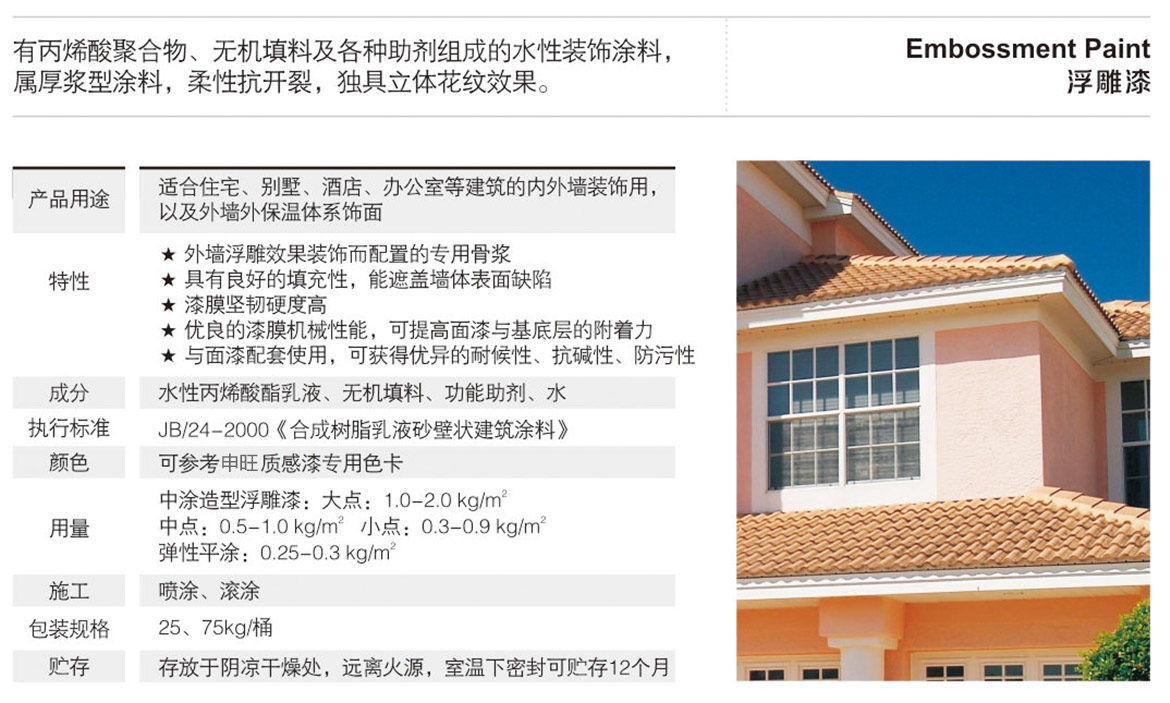 有丙烯酸聚合物、無(wú)機(jī)填料及各種助劑組成的水性裝飾涂料,屬厚漿型涂料,柔性抗開(kāi)裂,具立體花紋效果。