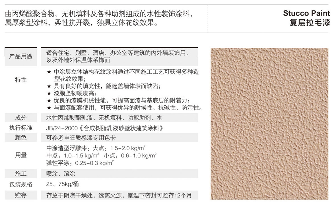 由丙烯酸聚合物、無(wú)機(jī)填料及各種助劑組成的水性裝飾涂料,屬厚漿型涂料,柔性抗開(kāi)裂,具立體花紋效果。