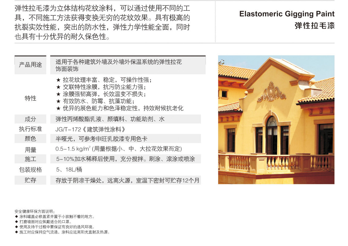 彈性拉毛漆為立體結(jié)構(gòu)花紋涂料,可以通過使用不同的工具,不同施工方法獲得變換無窮的花紋效果。具有高的抗裂實(shí)效性能,突出的防水性,彈性力學(xué)性能全,同時也具有十分優(yōu)異的耐久保色性。