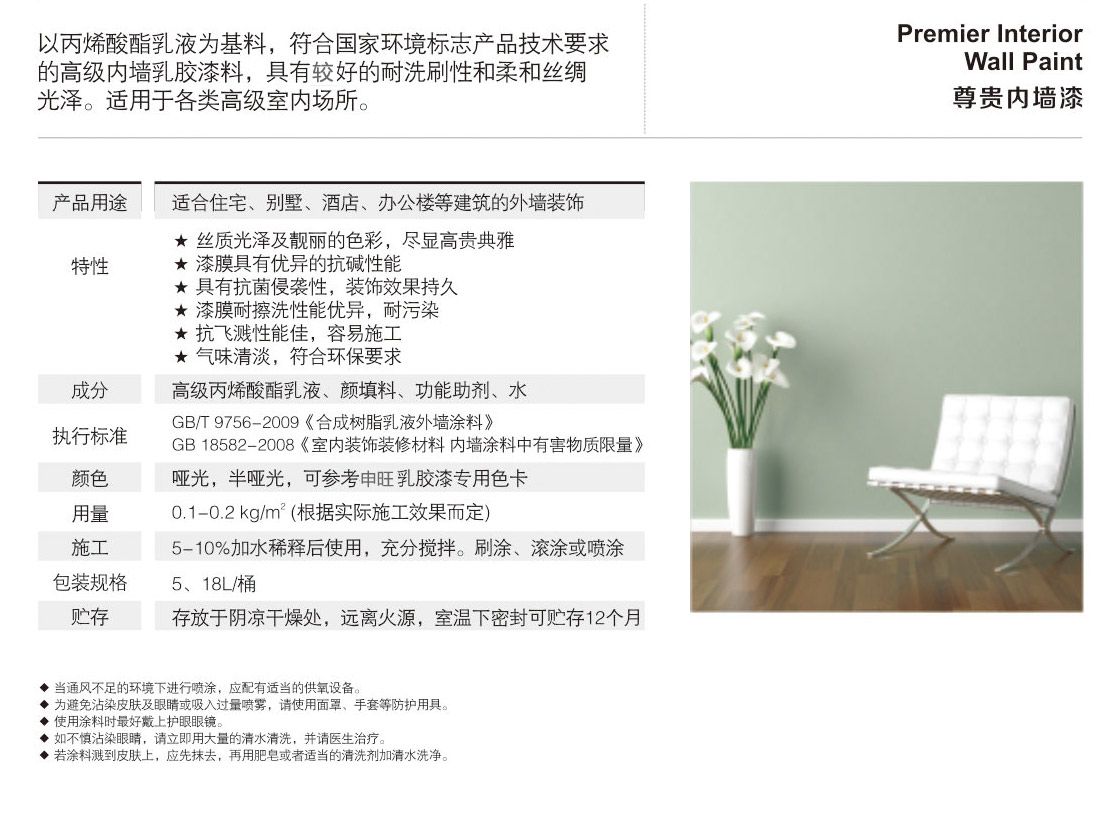以丙烯酸酯乳液為基料,符合國家環(huán)境標志產(chǎn)品技術要求的內(nèi)墻乳膠漆料,具有好的耐洗刷性和柔和絲綢光澤。適用于各類室內(nèi)場所。