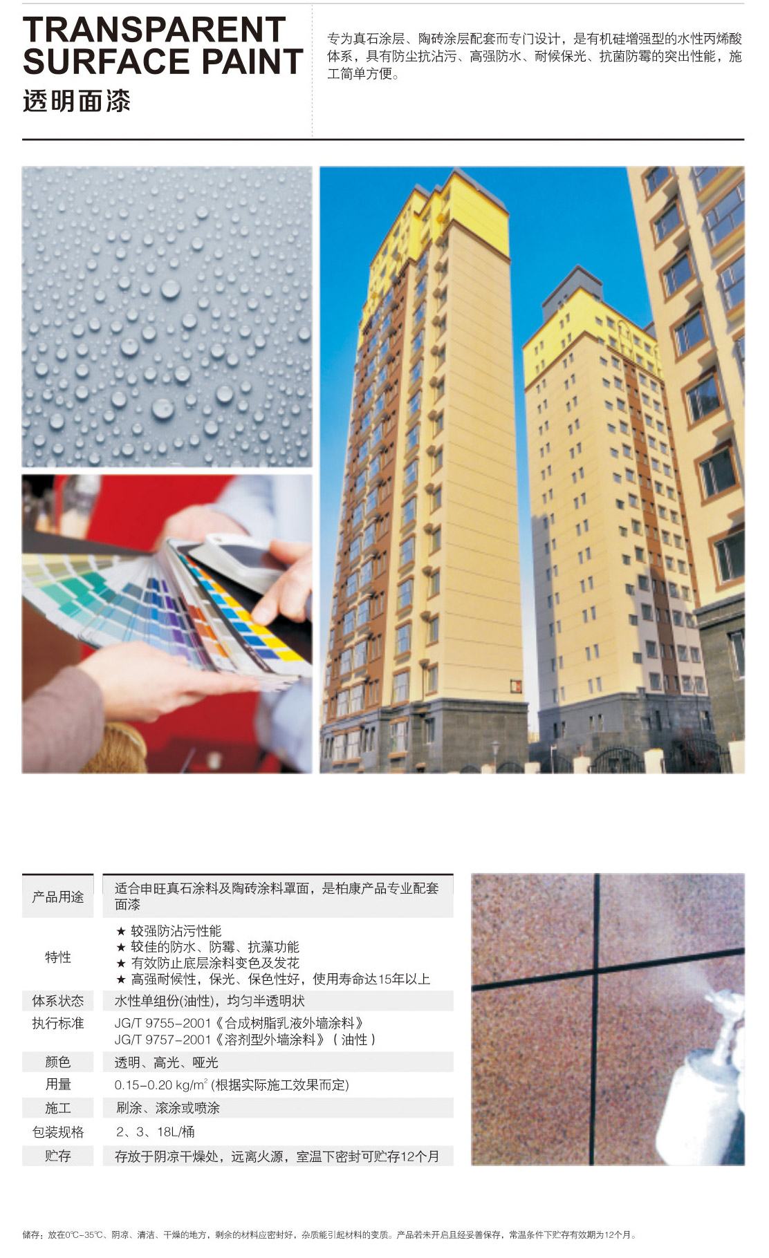 專為真石涂層、陶磚涂層配套而專門設(shè)計(jì),是有機(jī)硅增強(qiáng)型的水性丙烯酸體系,具有防塵抗沾污、高強(qiáng)防水、耐候保光、抗菌防霉的突出性能,施工簡單方便。