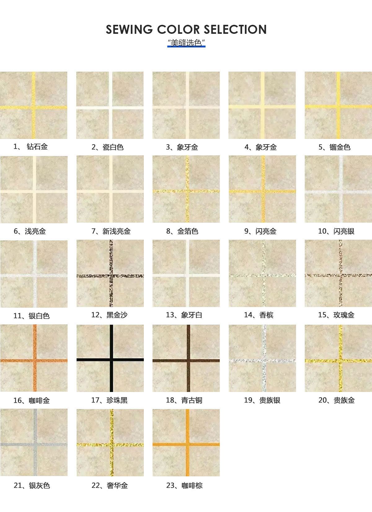20、貴族金 加入了比奢華色更大的亮片,尊貴感更深一層,適合在更大的瓷磚縫中使用。